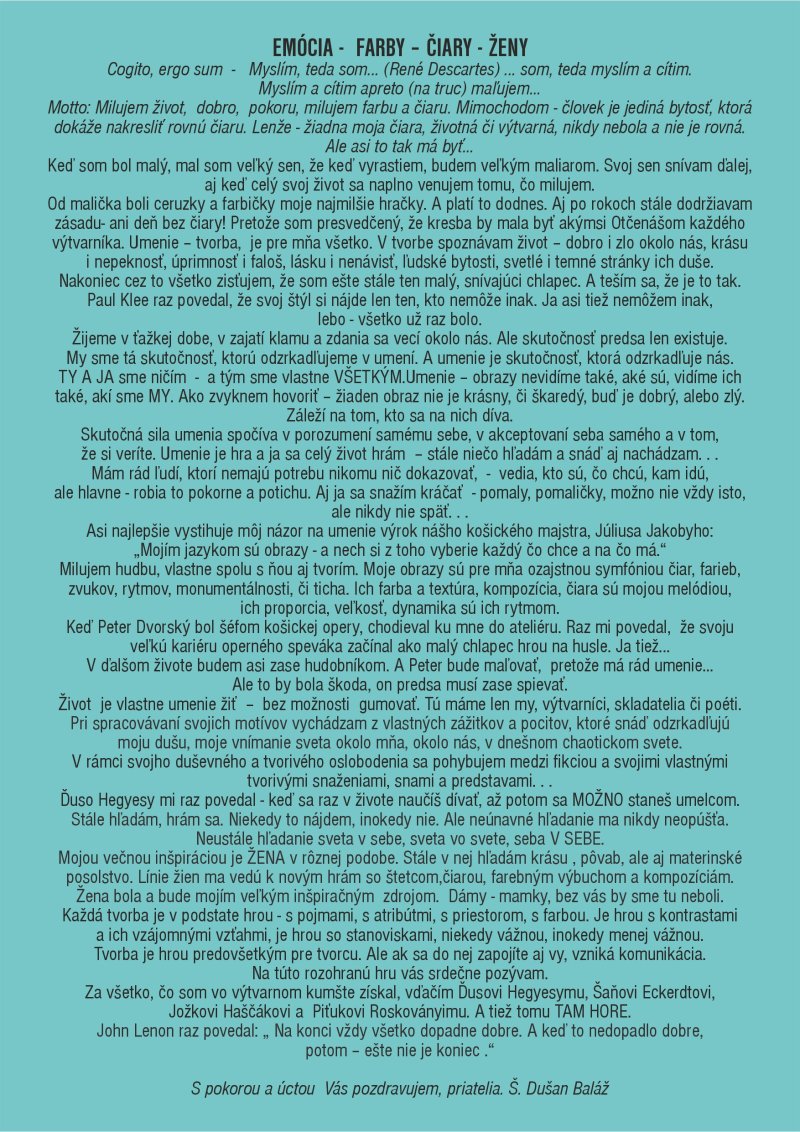Majster farieb Dušan Baláž nie je len úprimný umelec, ale aj úprimný človek, ktorý nemá problém svoju úprimnosť vyjadriť nahlas. Slovom i štetcom. Ale aj to je zrejme výsledok toho, (že ako hovorí) hľadá svet v sebe a seba i svoju poctivú životnú úlohu v tomto svete. Uvedomujúc si, že talent je darom nebies a preto s ním treba zaobchádzať čestne. Takže jeho výstava nie je a nebola o kasínach, ale o umeleckej úprimnosti! A keď si prepočítate rok jeho narodenia a terajší stav kalendára, prídete na to, že Dušan sa prišiel do Prešova vlastne tešiť zo svojho okrúhlo-hranatého životného jubilea.