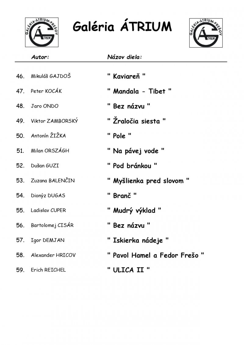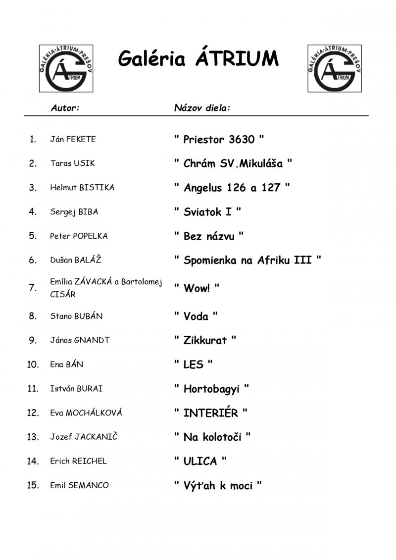 Všetky priestory galérie a penziónu Átrium dnes patria umelcom, ktorí tu vystavovali počas jej 15-ročnej existencie. Pod jednou strechou prezentujú svoju tvorbu výtvarníci z východu republiky, zo vzdialenejších regiónov Slovenska, ako aj umelci z Českej republiky, Poľska, Maďarska a Ukrajiny. Do tejto rodiny patria aj prešovskí rodáci, ktorí žijú a tvoria v rôznych kútoch sveta.