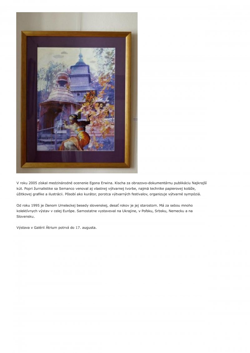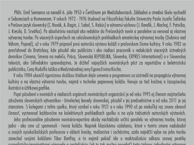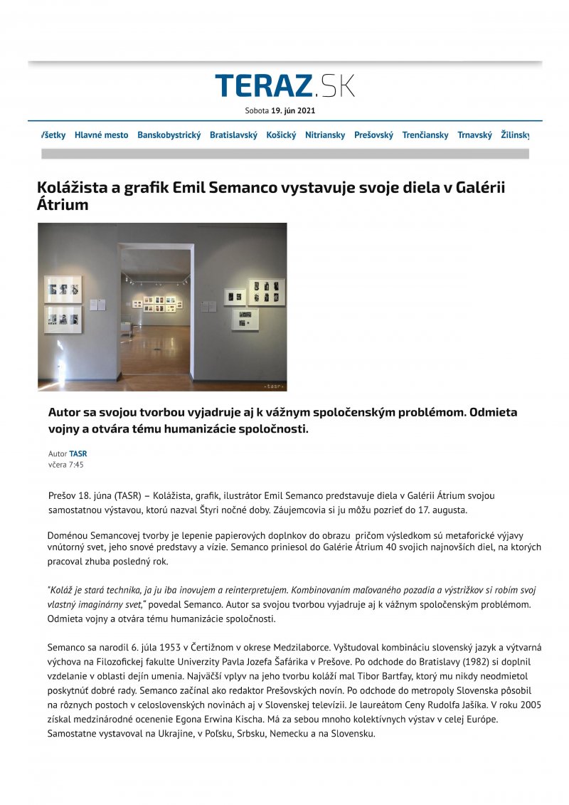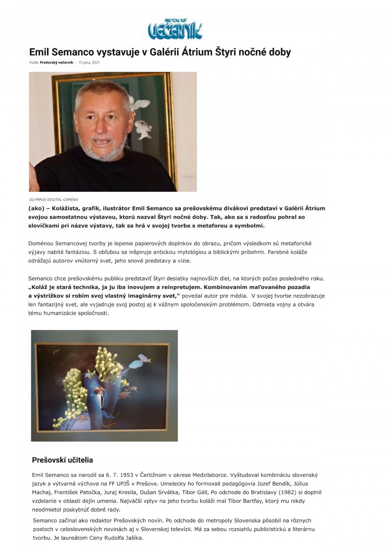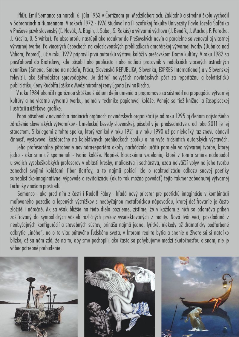 Kolážista, grafik, ilustrátor Emil Semanco sa prešovskému divákovi predstaví v Galérii Átrium svojou samostatnou výstavou, ktorú nazval Štyri nočné doby. Tak, ako sa s radosťou pohral so slovíčkami pri názve výstavy, tak v jeho výtvarnom prejave môžeme vidieť, že sa rád hrá s metaforou a symbolmi. Doménou Semancovej tvorby je lepenie papierových doplnkov do obrazu, pričom výsledkom sú metaforické výjavy nabité fantáziou. S obľubou sa inšpiruje antickou mytológiou a biblickými príbehmi. Farebné koláže odrážajú autorov vnútorný svet, jeho snové predstavy a vízie.