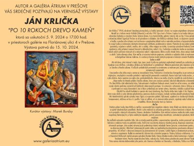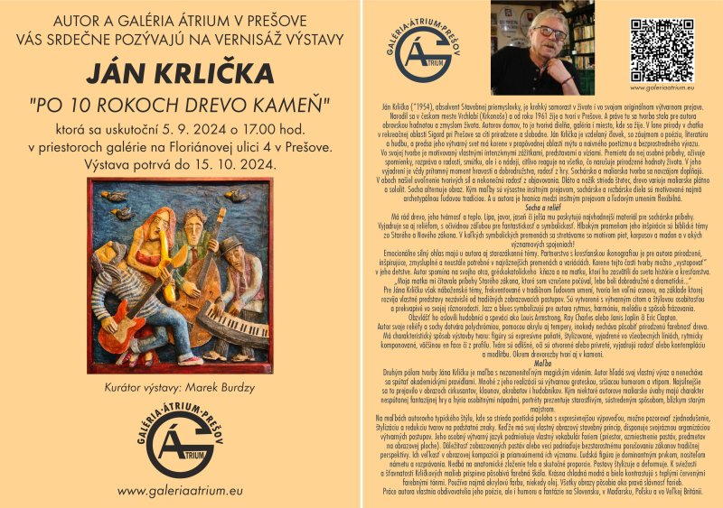 Prvý tohtoročný samostatne vystavujúci Prešovčan v Galérii Átrium je od 5. septembra známy všeumelec Janko Krlička, ktorý svoju tvorbu predstavuje na dvoch výstavných podlažiach. Názov jeho kolekcie „Po 10 rokoch drevo kameň“ je vlastne za určitých okolností všeobecne uznávanou pravdou, ktorú umelec potvrdzuje svojimi dielami. Kurátor výstavy, v našom meste už dávno bezmála udomácnený poľský výtvarník Marek Burdzy, vo svojom úvodnom hodnotení výstavného súboru zdôraznil, že autor sa v podstate zaoberá premieňaním mŕtveho materiálu na živé umenie, ktorého výsledkom sú akoby živé obrazy. Obrazy z histórie, zo života, i zo sakrálnej oblasti, ktoré neberú ohľad na dimenzie svetov. A dodáva, že